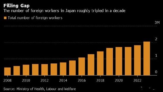 日本厚生劳动省周五报告称,日本的外籍劳工人数在2023年首次突破200万,突显出日本越来越依赖外部劳动力来缓解日益严重的劳动力短缺问题。