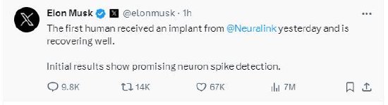 当地时间周一晚间,马斯克在X平台上发帖称,第一位人类患者已经接受其初创公司Neuralink Corp.的大脑植入芯片,患者“恢复良好”且初步结果令人鼓舞。