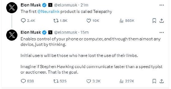 马斯克随后发帖称:“Neuralink的首个产品名为Telepathy(心灵感应)。