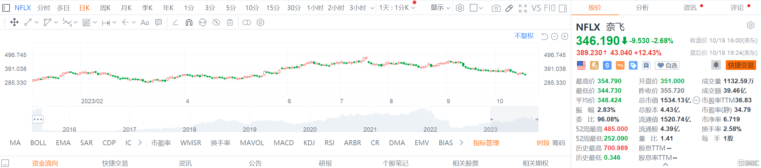 隔夜美股盘后,流媒体巨头奈飞公布了三季度业绩。业绩公布后,财报发布后,奈飞股价由收盘时的跌2.68%转为暴涨12.43%,最新报389.23美元/股。