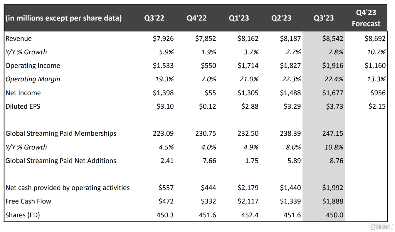 具体来看,三季度,奈飞营收85.42亿美元,同比增长 7.8%,基本符合预期;