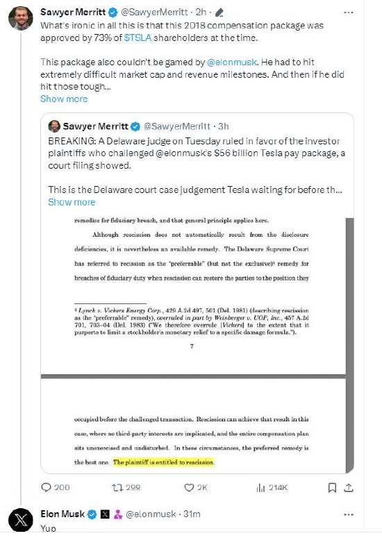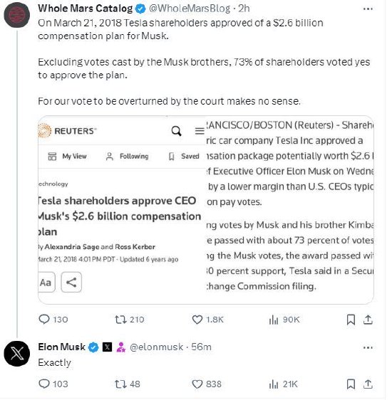 马斯克的粉丝纷纷为他鸣不平,X用户“Whole Mars Catalog”发帖称:“2018年3月21日,特斯拉股东批准了一项26亿美元的马斯克薪酬计划。除去马斯克兄弟的投票,73%的股东投了赞成票。我们的投票被法院推翻是没有道理的。”他还晒出了当年媒体报道的截图,以证明他所说的是事实。