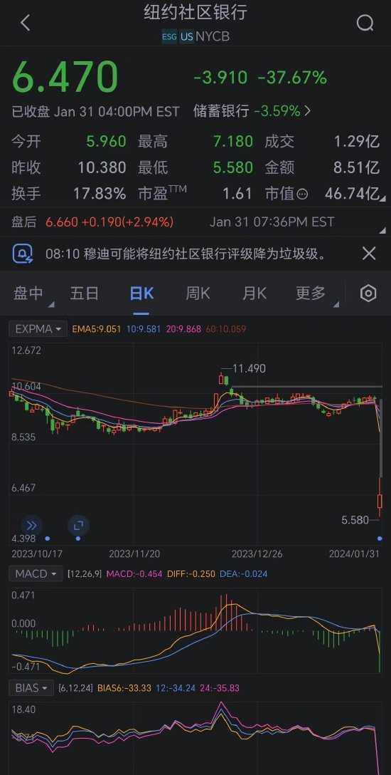 纽约社区银行股价周三盘中一度暴跌46%,纽约市场收盘时跌38%。KBW地区银行业指数跌6%,创去年3月硅谷银行倒闭以来表现最差的一天。