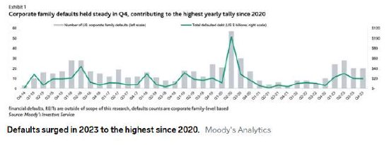 2023年,美国非金融企业的违约数量比前一年增加了近两倍,穆迪预计,这一趋势将在新的一年持续下去。
