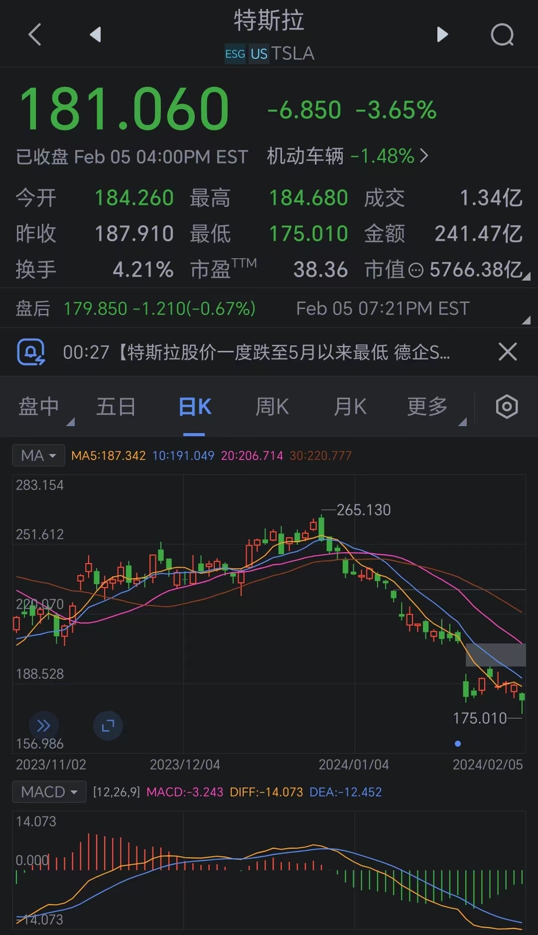 美东时间2月5日,特斯拉股价再遭打击向下,盘中一度跌近7%,收跌3.65%,报181.06美元,最新总市值5755.76亿美元,市值一夜蒸发超218亿美元(约1600亿元)。 消息面上,据德国媒体报道,德国IT巨头思爱普(SAP)将特斯拉从其汽车供应商名单中移除。SAP车队负责人Steffen Krautwasser表示,特斯拉的价格波动导致规划变得更加困难,并带来更高的风险。报道援引这家德企的发言表示,特斯拉通常早于约定的时间交付,这给作为客户的SAP造成了麻烦。 此外,美国国家公路交通安全管理局(NHTSA)美东时间上周五宣布,因为仪表盘上制动、驻车和防抱死制动警示灯不符合要求,美国电动汽车制造商特斯拉公司正在该国召回近220万辆车。另外,派杰投资将特斯拉目标价从295美元下调至225美元。