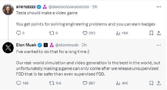另一位X用户发帖称:“特斯拉应该做一款视频游戏。你可以通过解决工程问题获得积分,还可以获得徽章。”