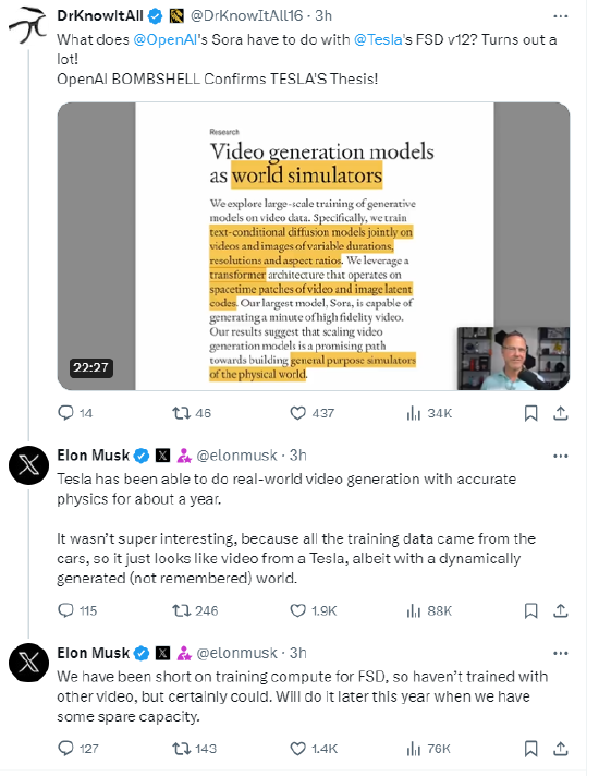 一位X用户发帖称:“OpenAI的Sora与特斯拉(199.95, -0.50, -0.25%)的FSD v12有什么关系?结果是有很多!OpenAI的重磅炸弹证实了特斯拉的理论!“