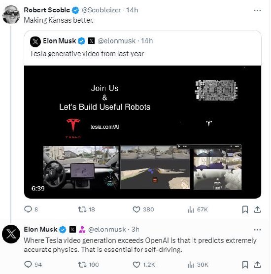 此前一天马斯克暗示,特斯拉早在一年前就掌握了类似OpenAI的视频生成技术。