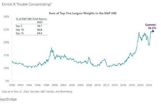 ClearBridge的策略主管杰弗里·舒尔茨(Jeffrey Schulze)也指出,目前市场上最大五只股票占标普500指数的权重约为24%,远高于互联网泡沫时期的高点。