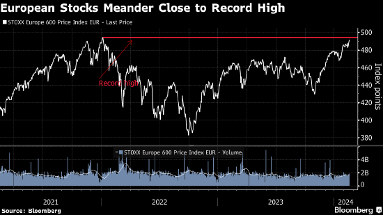 欧洲股市一直徘徊在历史高点附近,但尚未像美国股市一样取得突破。该地区公司第四季度业绩逊于预期的比例为至少四年来最大。
