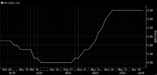 韩国央行将7天期回购利率维持在3.5%,符合经济学家的预期。该行上一次上调利率是在2023年1月,此后一直将利率维持在这一被认为具有限制性的水平。