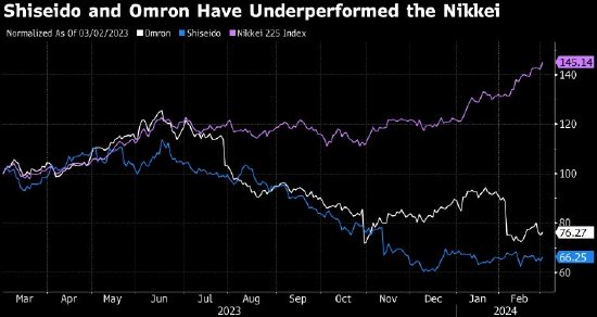在这个劳动法全球最严格的国家,上述举动比较罕见。在日经225指数高歌猛进升至纪录高位之际,这波涨势中的掉队者正面临越来越大的压力。在同类股票飙升的同时,资生堂和欧姆龙的股价已较各自去年的峰值下跌约40%。