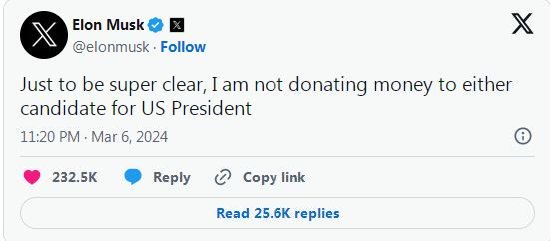 马斯克在他的社交媒体网站X上发帖称:“我要非常明确地说,我不会给任何一位美国总统候选人捐款。”