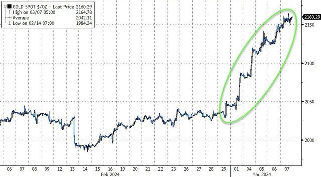 黄金再度刷新历史新高,COMEX 4月黄金期货收涨0.32%,报2165.20美元/盎司,连涨六个交易日,连续五日创收盘历史新高;现货黄金一度涨近2165美元,连续刷新2023年12月4日所创的盘中历史新高。