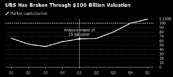 就在一年前的那个周日宣布由瑞士政府斡旋的紧急收购计划时,交易对瑞银股价是福是祸还是未定之数。这家总部苏黎世银行的股价次日一度暴跌16%,因为交易充满不确定性,导致其市值跌破600亿美元。