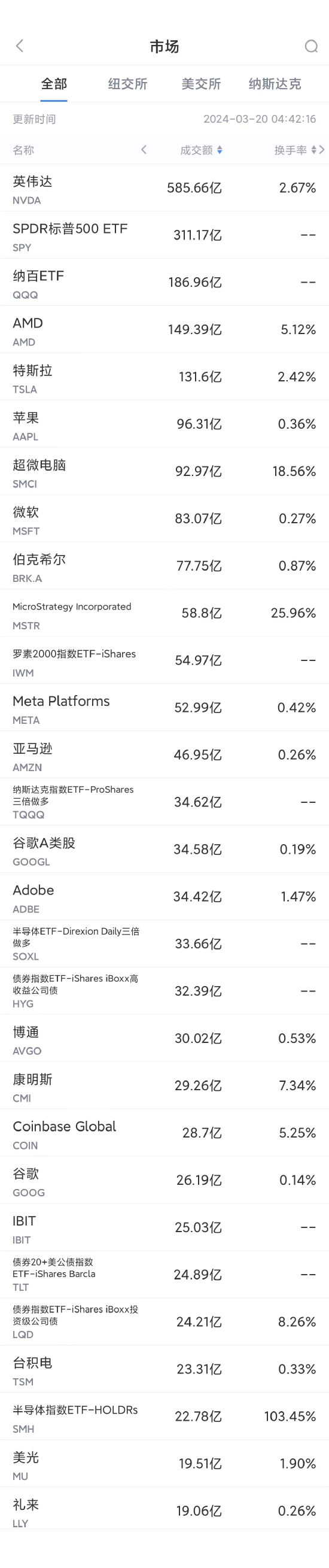 第3名特斯拉收跌1.43%,成交131.6亿美元。特斯拉周二宣布其小程序已向公众开放,允许更多品牌电动车用户共享其超过800座充电站和4600多个充电桩。这一举措旨在为电动车用户提供便捷的一站式补能体验,包括找站、导航、降锁、充电和支付等服务。