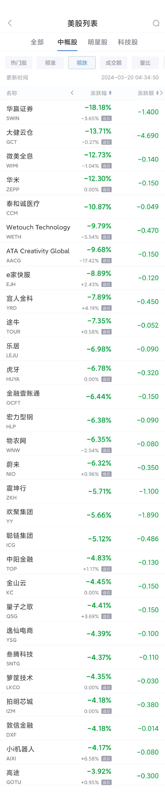 华赢证券跌18.18%,大健云仓跌13.71%,微美全息跌12.73%,宜人金科跌7.89%,途牛跌7.35%,虎牙跌6.78%,蔚来跌6.32%,震坤行跌5.71%,欢聚集团跌5.66%,聪链集团跌5.12%,金山云跌4.45%,高途跌3.92%。