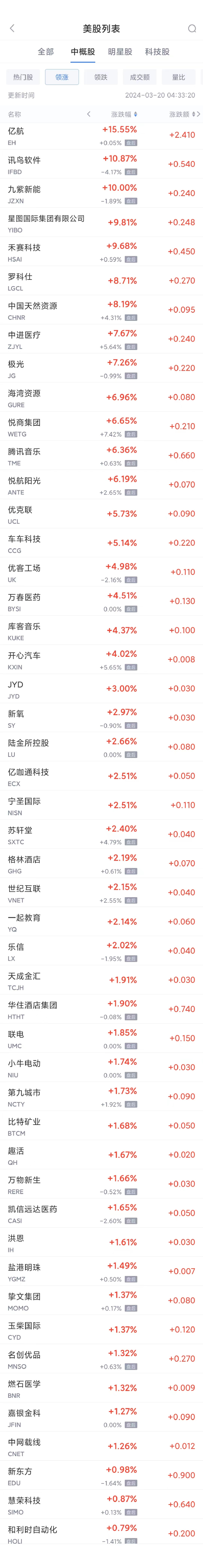 亿航涨15.55%,九紫新能涨10.00%,星图国际集团有限公司涨9.81%,罗科仕涨8.71%,中进医疗涨7.67%,腾讯音乐涨6.36%,车车科技涨5.14%,万国数据涨3.65%,网易有道涨3.50%,斗鱼涨3.39%,水滴公司涨3.36%,新氧涨2.97%,陆金所控股涨2.66%,亿咖通科技涨2.51%,格林酒店涨2.19%,世纪互联涨2.15%,乐信涨2.02%,华住酒店集团涨1.90%,联电涨1.85%,小牛电动涨1.74%,万物新生涨1.66%,雾芯科技涨1.55%,南茂科技涨1.50%,玉柴国际涨1.37%,名创优品涨1.32%,嘉银金科涨1.27%,挚文集团涨1.20%,新东方涨0.98%,慧荣科技涨0.87%,和利时自动化涨0.79%。