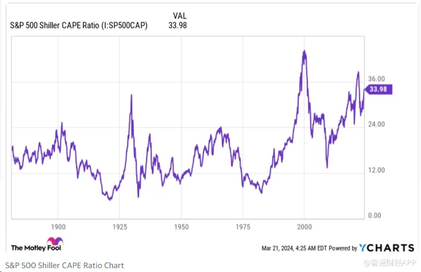 回溯至1871年,标普500指数的席勒市盈率平均为17.1倍,不算高。截至2024年3月20日收盘,标普500指数的席勒市盈率略低于35倍。这是牛市期间最高的倍数之一。