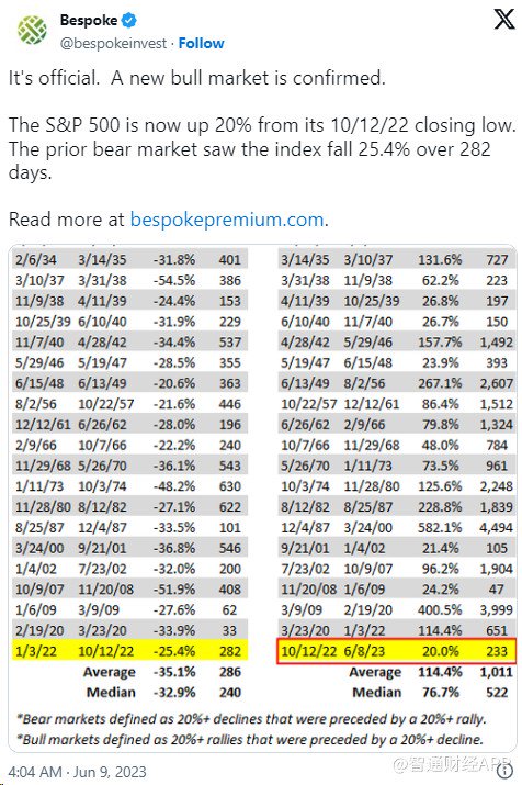 Bespoke的数据显示,熊市平均持续286个日历日,约为9.5个月。另一方面,在过去94年里,典型的牛市持续了1,011个日历日,大约是熊市平均时间的3.5倍。事实上,在Bespoke研究的27次牛市中,有13次的持续时间比最长的熊市还要长。