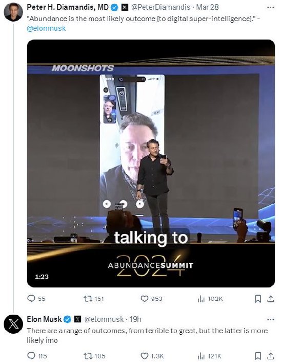 周四,零重力公司(Zero Gravity)的CEO彼得·戴曼迪斯在X上分享了一段3月17日至21日举行的富足峰会(Abundance Summit)的视频。