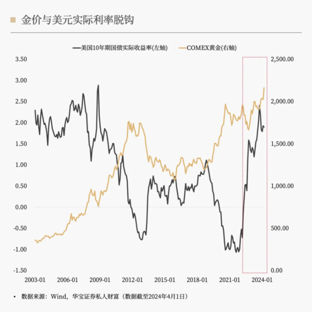 一是,去年以来,黄金价格和美元实际利率不再保持明显负相关,两者开始“脱钩”。