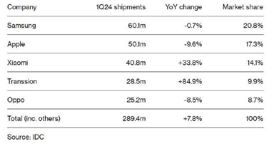 一季度全球移动市场手机出货量增至2.894亿部,同比增长7.8%。三星电子重回榜首。低价品牌传音控股出货量增长85%,小米出货量反弹,与第二名苹果公司的差距缩小。
