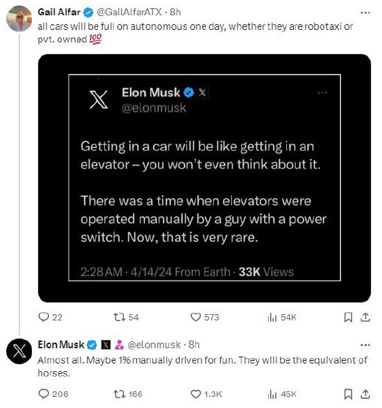 马斯克回应称:“几乎所有汽车。也许有1%是为了好玩而手动驾驶。它们将相当于马。”