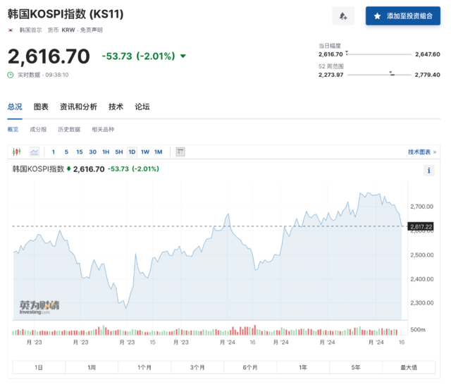 韩国首尔综指开盘下跌1%,截至发稿跌幅扩大至2%,至2616.7。