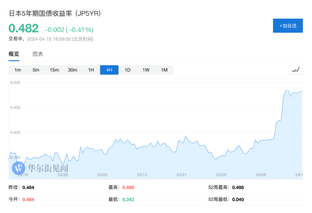 日本5年期国债收益率上升至2011年4月以来的最高水平。