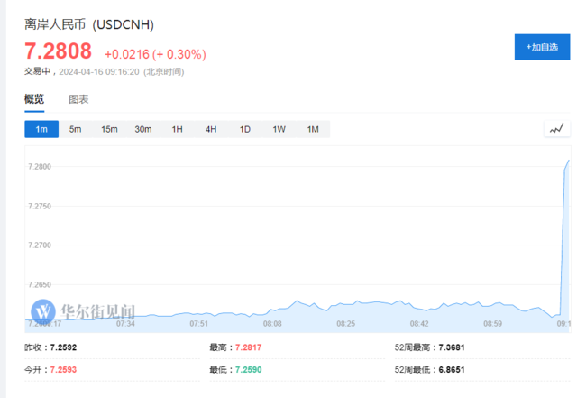 离岸人民币兑美元短线走低约200点,一度跌破7.28。今日人民币兑美元中间价报7.1028,下调49点。