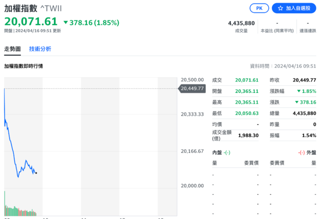 中国台湾证交所加权股指下跌近2%至20071.61点。