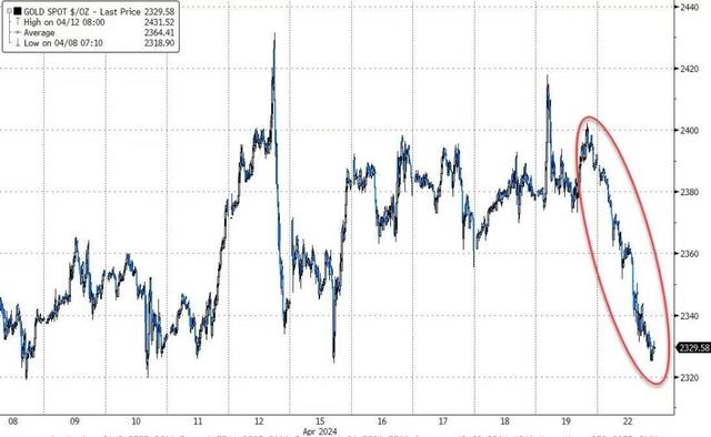 周一,黄金跳空低开,现货黄金一度下跌2.8%至每盎司2324.96美元的低点,日内跌幅近70美元/盎司,跌落上周五所创的收盘纪录高位,创下自2022年6月以来的最大盘中跌幅。