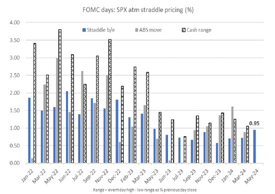 花旗策略师表示,期权交易员一直低估标普500指数在美联储决策日的波幅。自2022年初以来在每个美联储决策日标普指数的日内波动都比跨式期权策略预期得要大。
