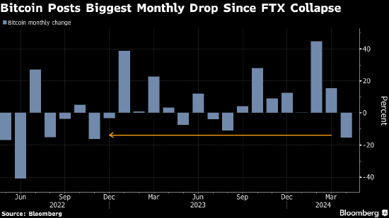 这个全球最大的数字资产4月大跌了近16%,此前对于美国现货比特币交易所交易基金(ETF)的狂热在3月份将该代币推升至近74000美元的纪录高位后趋于平息。