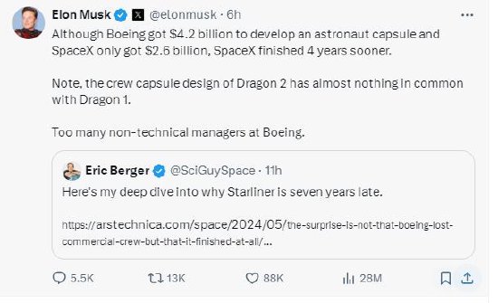 马斯克周一在X平台上发帖称:“尽管波音获得了42亿美元用于开发宇航员太空舱,而SpaceX只获得了26亿美元,但SpaceX比波音早完成了4年。请注意,龙飞船2乘员舱设计与龙飞船1几乎没有任何共同之处。波音公司有太多非技术管理人员。”