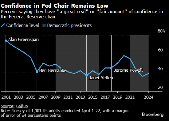 此次调查显示,39%的美国成年人表示他们对美联储主席为经济做正确的事抱有“很大”或“相当程度”的信心。这一比例略高于一年前物价涨幅更高之时的36%。波动幅度在民调4个百分点的误差范围之内。