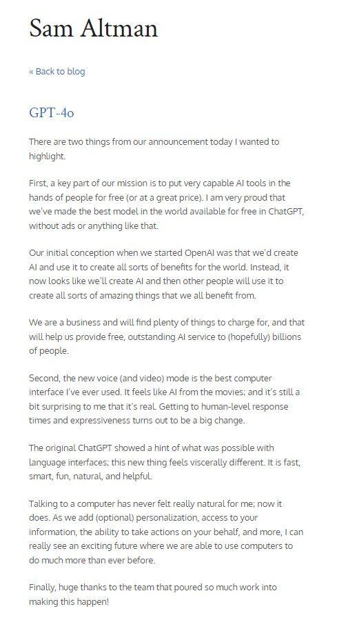 他认为,这是用最低的价格甚至是免费,将最好的模型提供给世界上所有人,同时达到与人类相似的响应速度和表达能力,标志着一个重大的转变,并预见到一个激动人心的未来。