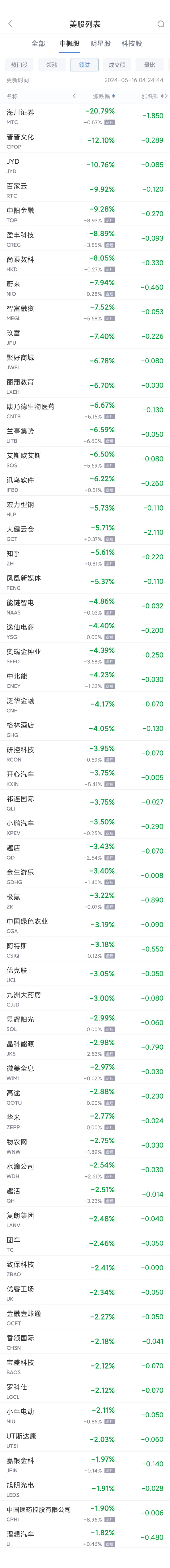 下跌股当中(按市值降序排列),理想汽车跌1.82%,联电跌0.24%,中通跌0.79%,新东方跌1.55%,华住酒店集团跌1.57%,蔚来跌8.03%,小鹏汽车跌3.50%,极氪跌3.26%,WSP控股跌1.24%,汽车之家跌0.92%。