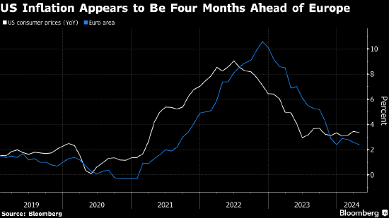 欧元区通胀率上升越来越多地被拿来与美国相提并论,这引发担忧欧洲央行在降息方面可能面临与美联储类似的障碍。