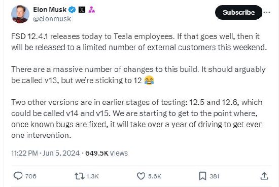 马斯克写道:“FSD 12.4.1今天发布给特斯拉员工。如果进展顺利,那么它将在本周末发布给有限数量的外部客户。