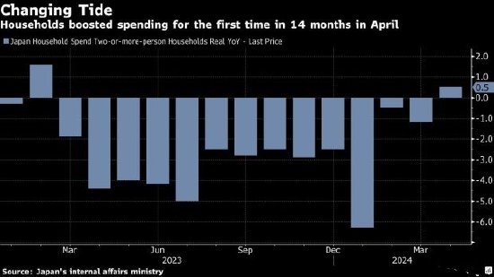 日本4月份家庭支出出现14个月来的首次增长,这一迹象表明,日本央行长期以来寻求的经济良性循环可能正开始出现。