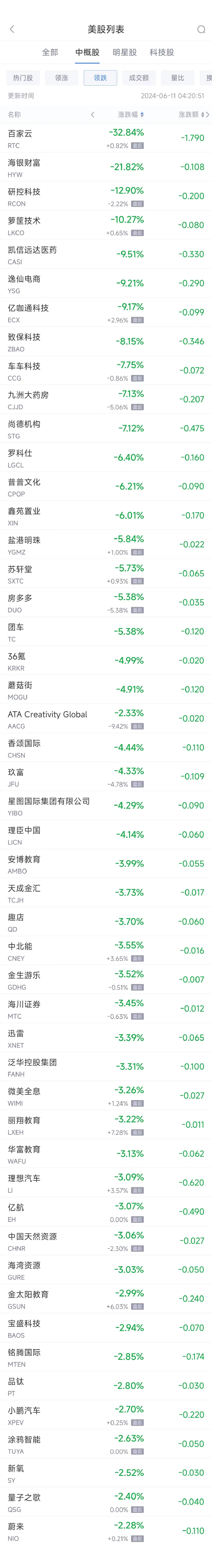 下跌股当中(按市值降序排列),百度跌0.43%,理想汽车跌3.09%,百济神州跌0.06%,华住酒店集团跌0.19%,富途控股跌0.03%,蔚来跌2.17%,BOSS直聘跌0.33%,小鹏汽车跌2.64%,极氪跌0.38%,爱奇艺跌0.12%,汽车之家跌1.54%。