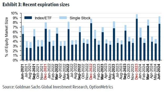 周五将到期的期权代表的名义价值相当于罗素3000指数市值的9.3%。这一比例高于绝大多数月份,仅次于2023年12月。