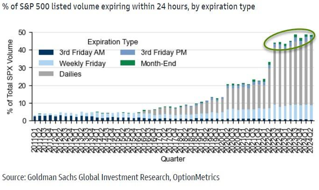近一半的标普500期权仍然是末日期权。当前散户交投仍然非常活跃,标普500指数SPX的1手期权和末日1手期权交易在总交易中的比例仍然很高。