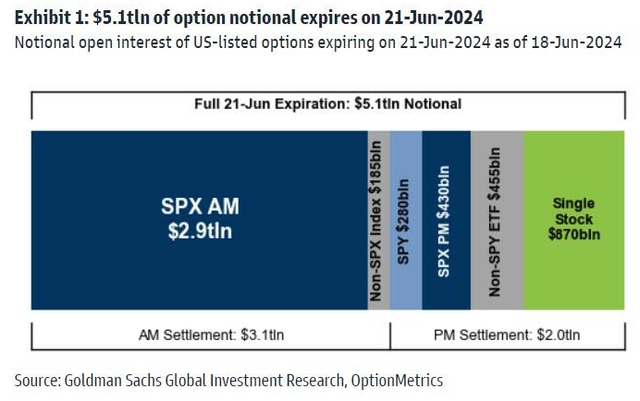 据期权分析平台SpotGamma估计,约5.5万亿美元的指数、股票和ETF期权将在周五到期。据高盛分析师John Marshall估计,到期期权的名义价值将超过5.1万亿美元,将是有史以来规模最大的一次。