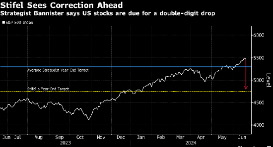 Stifel的分析师Barry Bannister表示,随着投资者不断涌入,标普500料在2024年底前升至6000点大关,该指数周四略低于5500点。但他预计,该指数到2026年中将回落至今年初的水平,即4800点左右,从而略跌约五分之一。