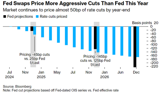 这是一个激进的立场。相较之下,市场参与者普遍预计这一时期美联储将降息约75个基点,美联储官员最近的预测是,到今年年底仅降息25个基点,到2025年底总共降息125个基点。