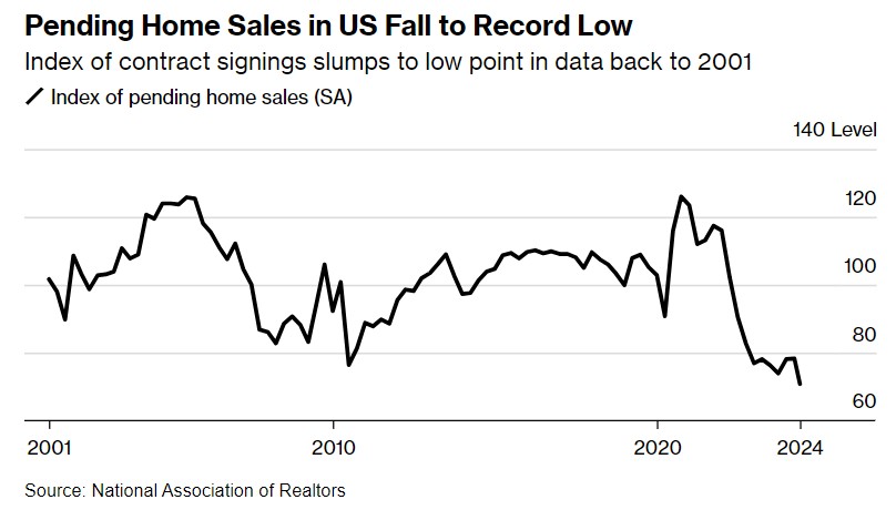 周四公布的另一份报告显示,在美联储长期维持高利率的重压之下,猛增至7%左右的抵押贷款利率对房地产市场的负面影响愈发猛烈。全美房地产经纪人协会(NAR)公布的二手房签约指数创下新的纪录,5月份的二手房签约数量意外跌至2001年以来的最低水平。
