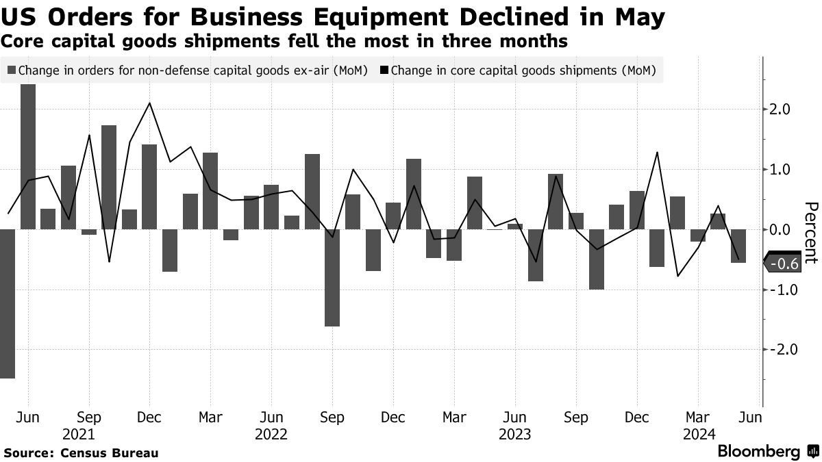 美国企业也全方位感受到了借贷成本上升的压力。周四公布的数据显示,5月份的核心资本货物订单值创下今年以来的最大降幅。核心资本货物订单一般来说是指除飞机和军事硬件外的设备投资规模。